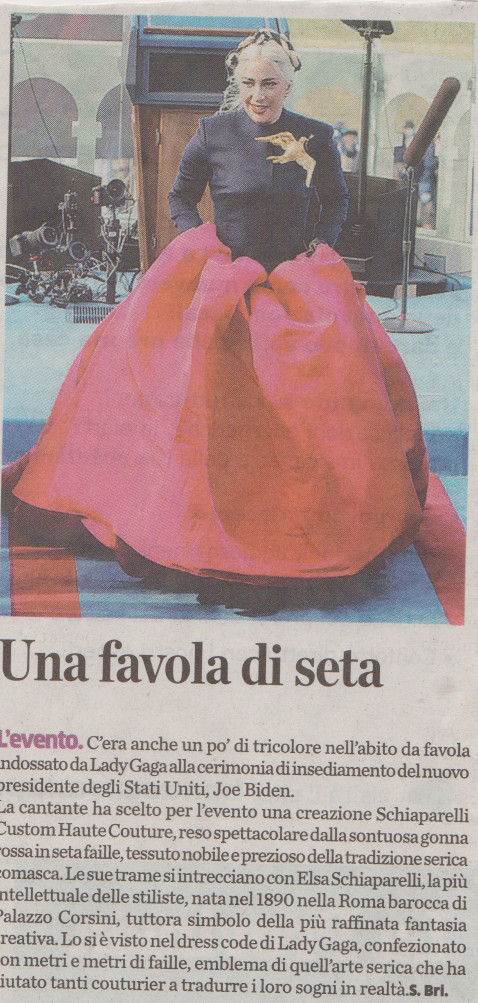 Lady Gaga canta l’inno nazionale americano all’insediamento del Presidente Joe Biden, 20 gennaio 2021. “Sontuosa gonna rossa in seta faille, tessuto nobile e prezioso della tradizione serica comasca” (in La Provincia di Como, 22 gen 2021)