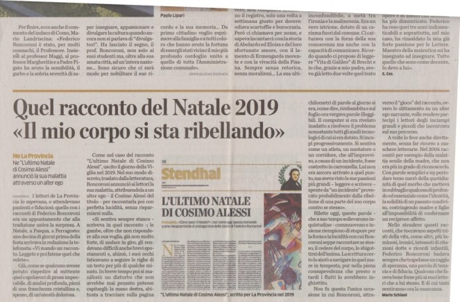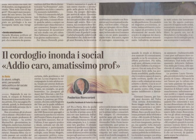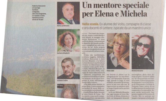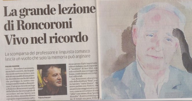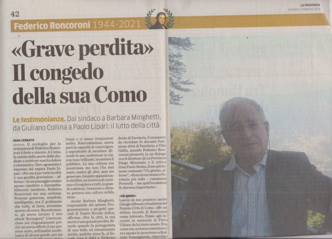 La grande lezione di FEDERICO RONCORONI. Vivo nel ricordo, articoli di Fulvio Panzeri, Lucia Valcepina, Alberto Longatti, Mario Chiodetti, Sara Cerrato, Alessio Brunialti in la Provincia / Stendhal 5 febbraio 2021