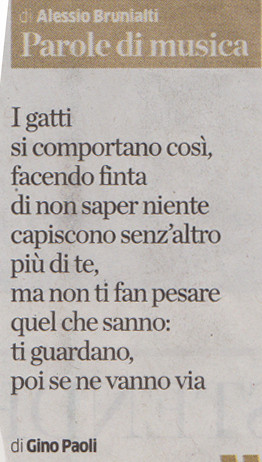 Brunialti Alessio · Gatti · MUSICA · Poesie I gatti si comportano così … di Gino Paoli, in Parole di Musica, a cura di Alessio Brunialti, in La Provincia di Como 31 gennaio 202218 settembre 2023 Paolo Ferrario Condividi su: Fai clic per condividere su Facebook (Si apre in una nuova finestra) Facebook Fai clic qui per condividere su LinkedIn (Si apre in una nuova finestra) LinkedIn Fai clic per condividere su WhatsApp (Si apre in una nuova finestra) WhatsApp Fai clic qui per condividere su Tumblr (Si apre in una nuova finestra) Tumblr Fai clic per inviare un link a un amico via e-mail (Si apre in una nuova finestra) E-mail Fai clic qui per condividere su Pinterest (Si apre in una nuova finestra) Pinterest Fai clic per condividere su Threads (Si apre in una nuova finestra) Threads Fai clic per condividere su Bluesky (Si apre in una nuova finestra) Bluesky Mi piace Caricamento... Correlati Condividi su: Fai clic per condividere su Facebook (Si apre in una nuova finestra) Facebook Fai clic qui per condividere su LinkedIn (Si apre in una nuova finestra) LinkedIn Fai clic per condividere su WhatsApp (Si apre in una nuova finestra) WhatsApp Fai clic qui per condividere su Tumblr (Si apre in una nuova finestra) Tumblr Fai clic per inviare un link a un amico via e-mail (Si apre in una nuova finestra) E-mail Fai clic qui per condividere su Pinterest (Si apre in una nuova finestra) Pinterest Fai clic per condividere su Threads (Si apre in una nuova finestra) Threads Fai clic per condividere su Bluesky (Si apre in una nuova finestra) Bluesky Mi piace Caricamento...
