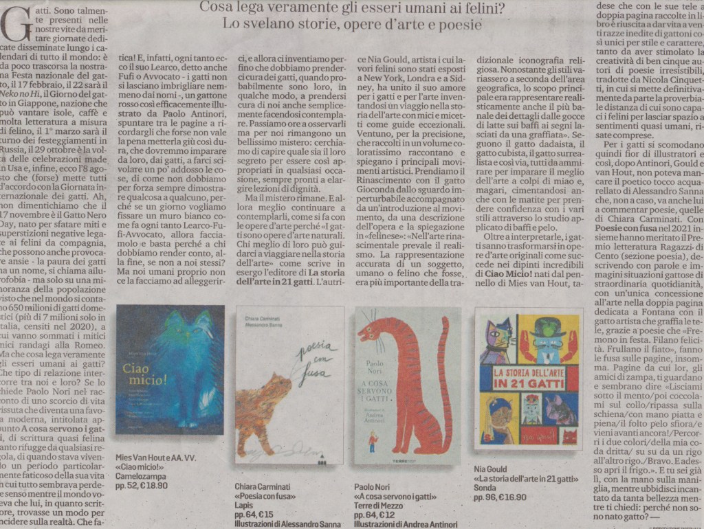 libri sui GATTI: Mies Van Hout, “Ciao micio!”, Camelozampa editore; Chiara Carminati, Poesia confusa, Lapis editore; Paolo Nori, A cosa servono i gatti, Terre di Mezzo editore; Nia Gould, La storia dell’arte in 21 gatti, Sonda editore, 2022