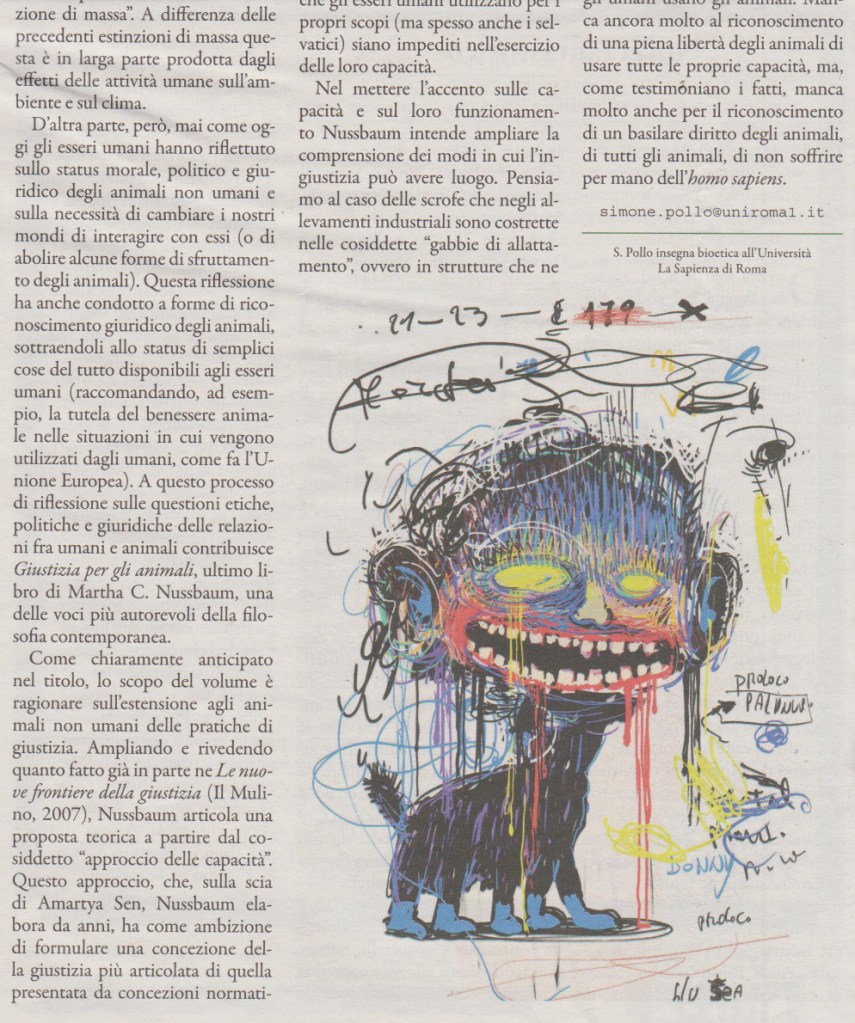Per Nussbaum considerare gli animali «automi senza una visione soggettiva del mondo», come si è ritenuto a lungo, è un vero e proprio peccato originale filosofico. Gli enormi progressi scientifici degli ultimi 30 anni ci rivelano infatti che tutti i vertebrati avvertono dolore, provano emozioni, hanno comportamenti non solo genetici ma anche appresi e forme di percezione che nemmeno gli umani hanno. Una volta riconosciuta la non facile demarcazione tra uomini e animali, difficilmente possiamo accettare di rimanere ancorati all’etica classica, che viene qui ripercorsa nei suoi vari sviluppi sino a giungere ad una proposta originale, basata sul capabilities approach, in grado anche di fornire diversi esempi pratici che la sua adozione comporta.