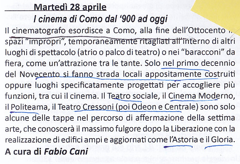 I cinema di Como dal ‘900 ad oggi, lezione di Fabio Cani, Università popolare, 28 aprile 2026. Appunti