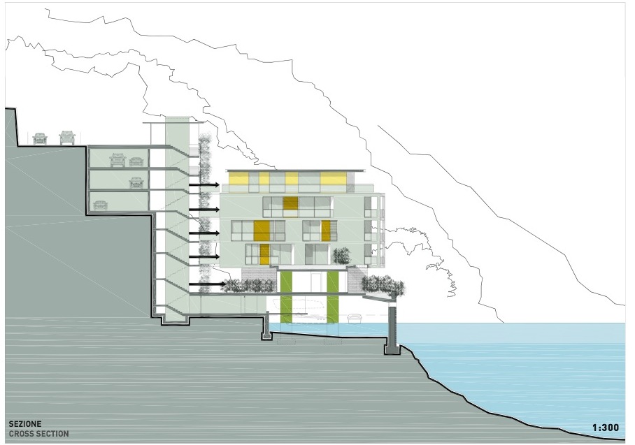 Sullo sfondo si vedono le linee che ben simboleggiano quel tuffarsi delle montagne nel lago e poi si vede bene che gli edifici occupano la linea dell’acqua. Cioè è un progetto di violazione del “luogo- lago”.