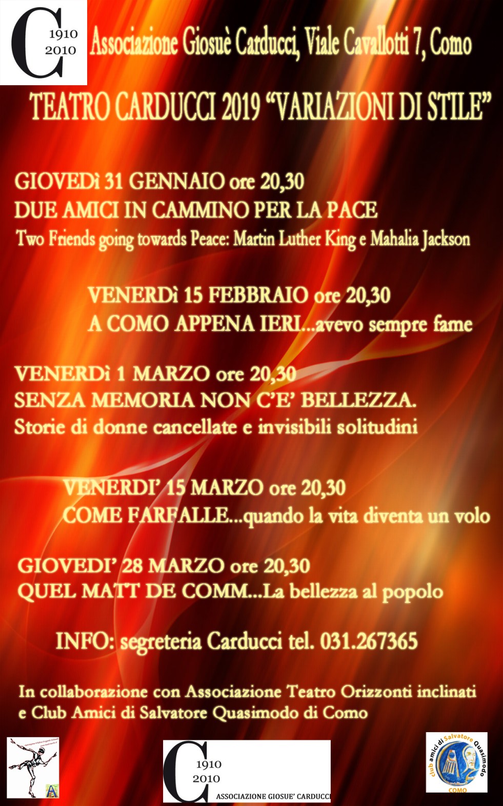 Per scoprire tutti gli spettacoli, la modalità di abbonamento all’associazione, per assicurarvi fin da ora un posto che permetterà la condivisione e serate di “cultura insieme”, per tutta la programmazione di appuntamenti pensati appositamente con il fine di divulgare belle sensazioni, valori profondi e anche la gioia di conoscere artisti che hanno fatto e continuano a fare la storia del Novecento, visitare la pagina https://www.facebook.com/AssociazioneCarducciComo/ nell’attesa del nuovo sito dell’associazione che sarà online a breve.