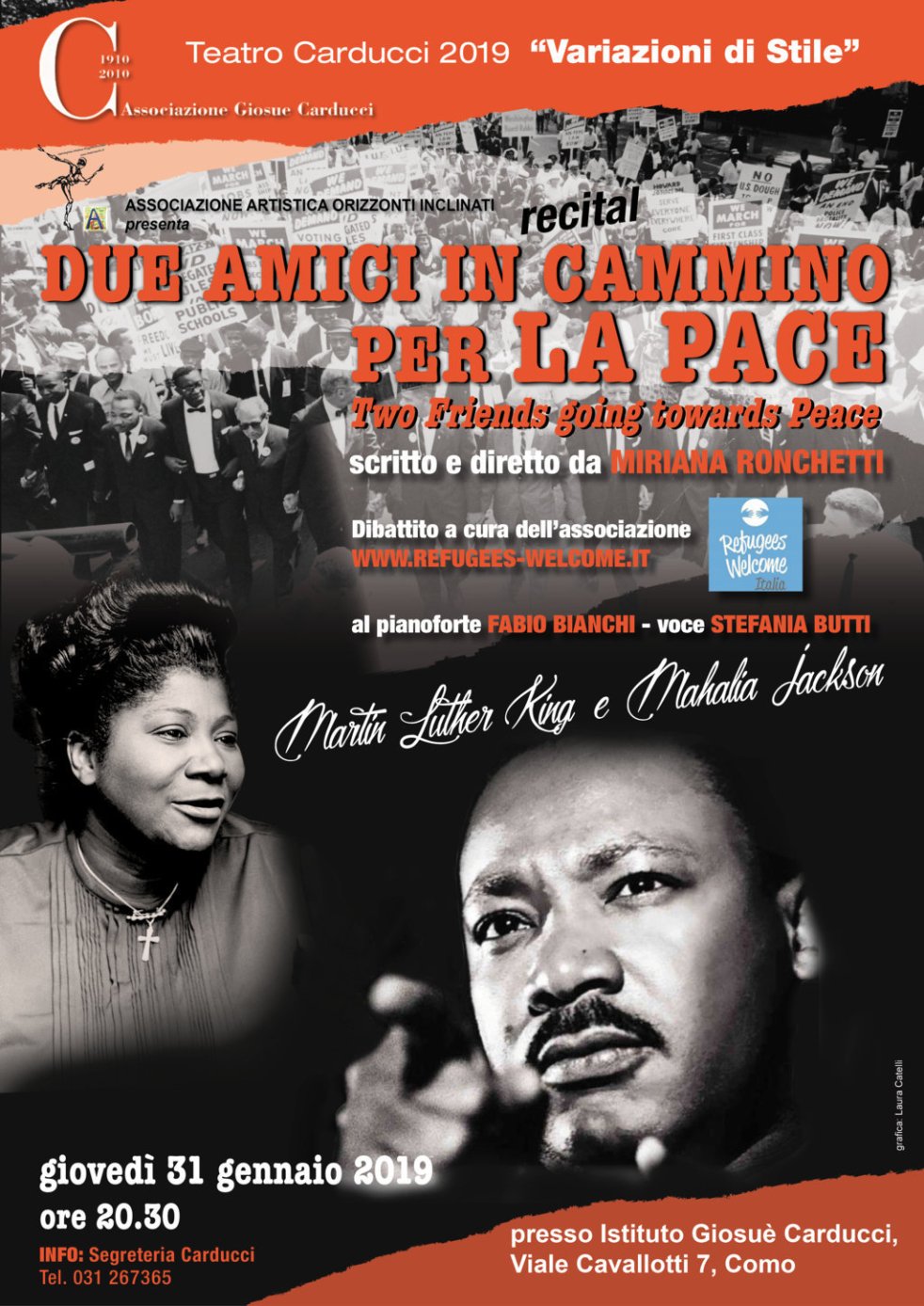 Recital- incontro pensato per far conoscere personaggi del ‘900 che hanno lottato per la pace e la conquista dei diritti umani. Immagini, parole e musiche per raccontare il percorso di grandi anime che hanno popolato il secolo passato; fare conoscere ai giovani il periodo della marcia verso i diritti umani. Testo e regia di Miri Ronchetti Recital: il cammino di due grandi anime fra canto e parole. Con Miri Ronchetti. Testo di Miriana Ronchetti. Fabio Bianchi al pianoforte. Canta Stefania Butti. Nel corso della serata verrà presentata l’attività del gruppo territoriale associazione www.refugees-welcome.it
