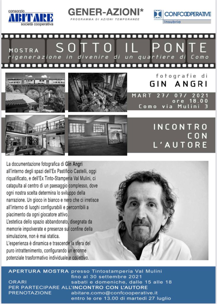 Gin Angri ha scattato e mette in mostra una serie di 60 immagini (esposte stampate in bianco e nero su pannelli 50×70 centimetri) che interpretano, con occhio critico e con un punto di vista speciale, la Tintostamperia Val Mulini e le aree limitrofe nelle sue dinamiche di sviluppo recenti.24 lug 2021
