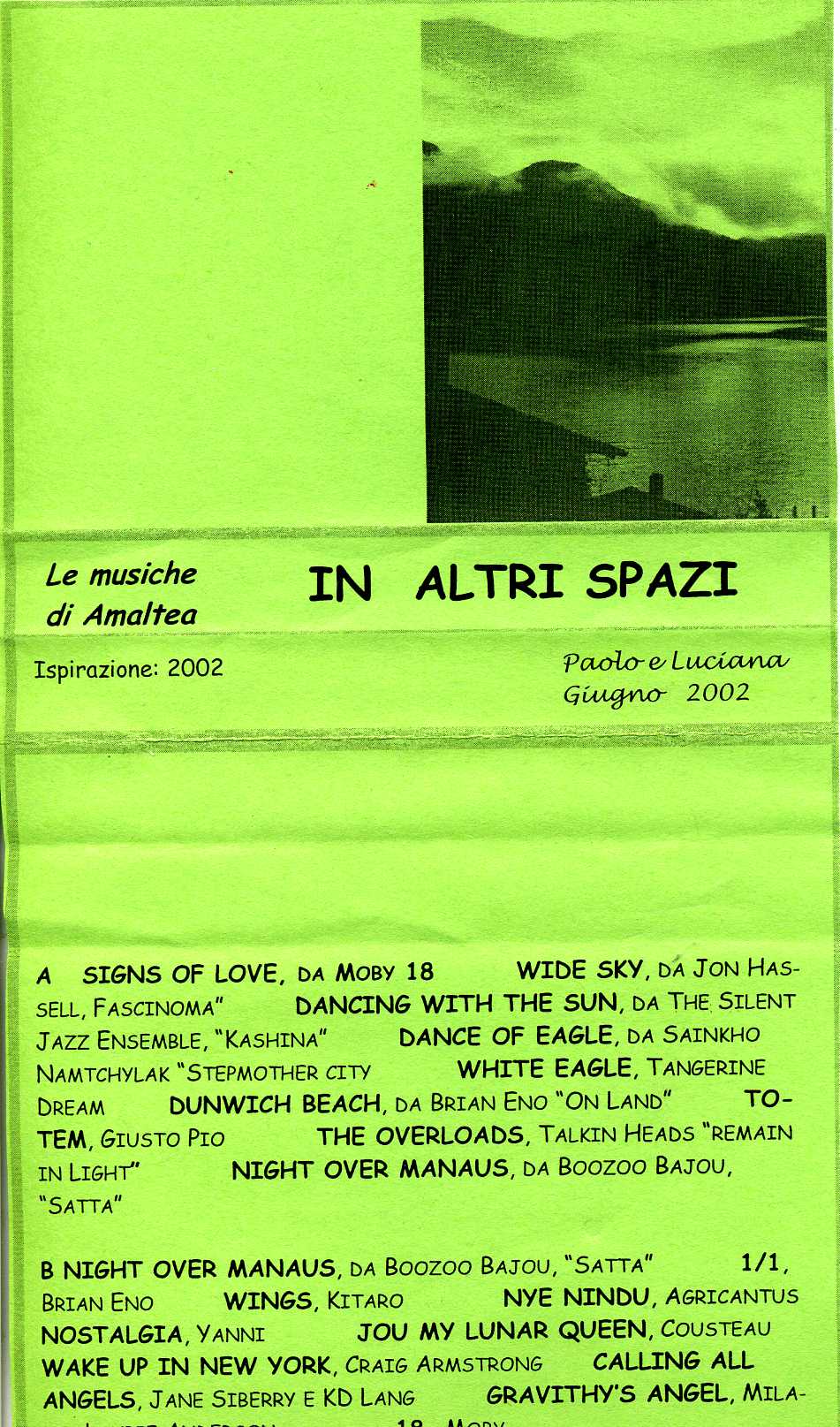 Antologie musicali · MUSICA le musiche di Amaltea: IN ALTRI SPAZI, giugno 2002 27 dicembre 201428 dicembre 2014 Paolo FerrarioLascia un commento Altri Spazi giu 2002 Condividi su: Condividi su Facebook (Si apre in una nuova finestra) Facebook Condividi su LinkedIn (Si apre in una nuova finestra) LinkedIn Condividi su WhatsApp (Si apre in una nuova finestra) WhatsApp Condividi su Tumblr (Si apre in una nuova finestra) Tumblr Invia un link a un amico via e-mail (Si apre in una nuova finestra) E-mail Condividi su Pinterest (Si apre in una nuova finestra) Pinterest Condividi su Threads (Si apre in una nuova finestra) Threads Condividi su Bluesky (Si apre in una nuova finestra) Bluesky Mi piace Caricamento... Condividi su: Condividi su Facebook (Si apre in una nuova finestra) Facebook Condividi su LinkedIn (Si apre in una nuova finestra) LinkedIn Condividi su WhatsApp (Si apre in una nuova finestra) WhatsApp Condividi su Tumblr (Si apre in una nuova finestra) Tumblr Invia un link a un amico via e-mail (Si apre in una nuova finestra) E-mail Condividi su Pinterest (Si apre in una nuova finestra) Pinterest Condividi su Threads (Si apre in una nuova finestra) Threads Condividi su Bluesky (Si apre in una nuova finestra) Bluesky Mi piace Caricamento...